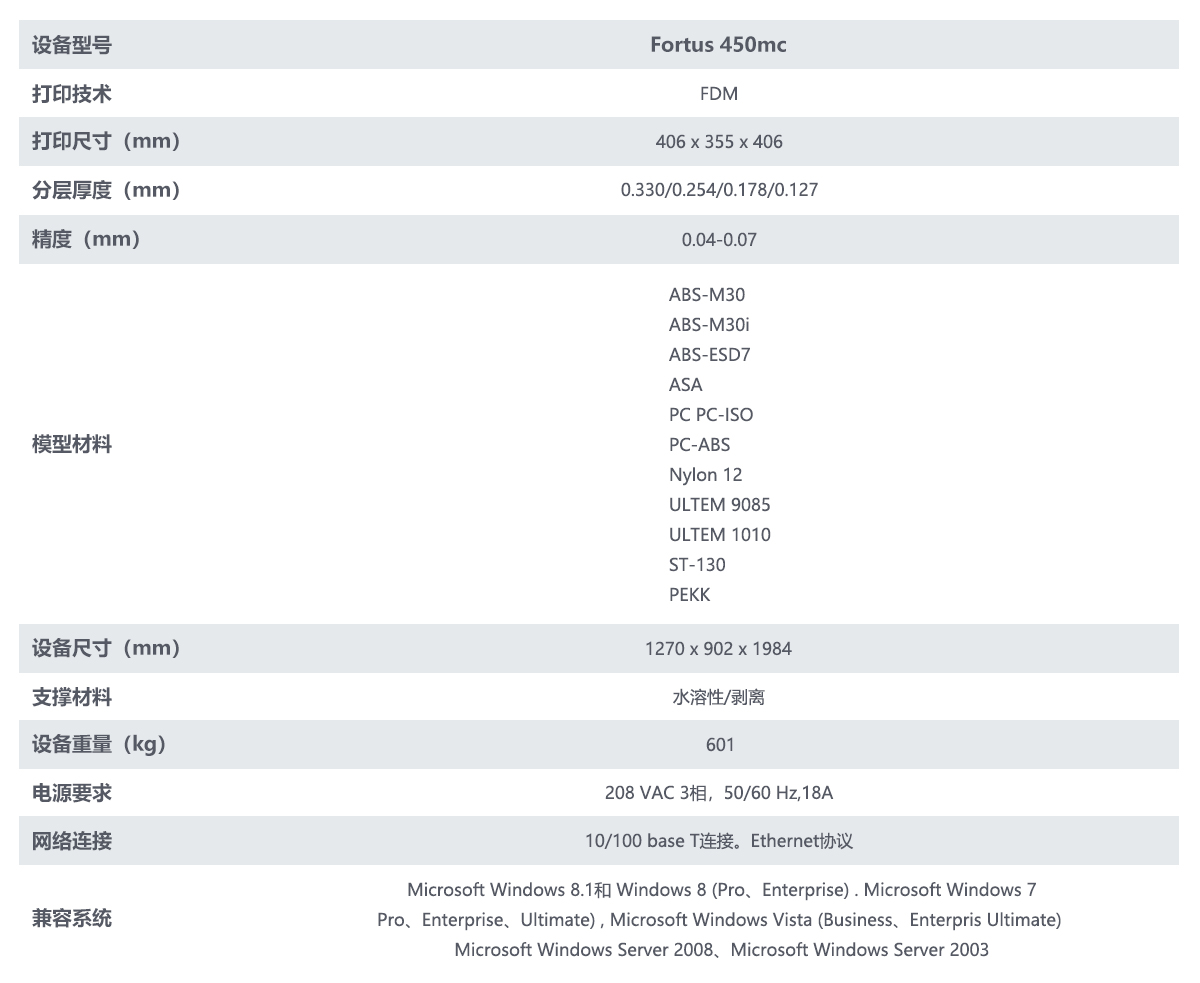 Fortus 450mc属于高性能工业级3D打印机,其特点是可使用常规打印机无法使用的高性能材料,包括防静电材料ABS-ESD7、生物相容性材料PC-ISO,还有工程级高性能材料包括PC、尼龙、碳纤维和PEKK等,这些材料可满足几乎各行业应用,可制造高质量的原型、坚固夹具、固定装置和工具,还可定制生产零件。Fortus 450mc针对要求严苛的应用可展现出特定的高端性能,使您的零件能够承受高温、腐蚀性化学物、消毒和高冲击性应用。